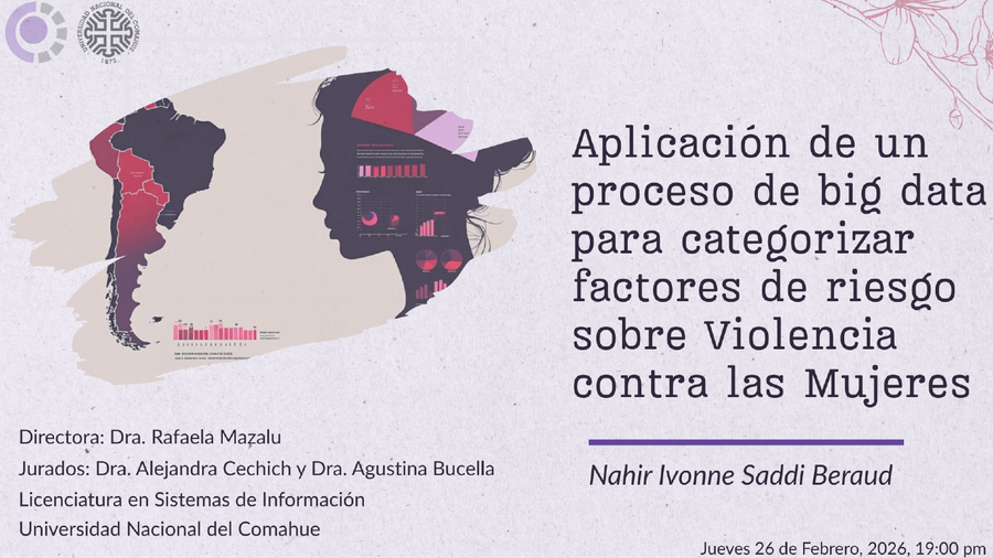 En el marco de la Licenciatura en Sistemas de Información (LSI), se llevará a cabo la defensa de tesis de grado de la estudiante Nahir Saddi Bernaud, titulada “Análisis de factores de riesgo asociados a la violencia contra las mujeres en Argentina mediante un enfoque de Big Data”.