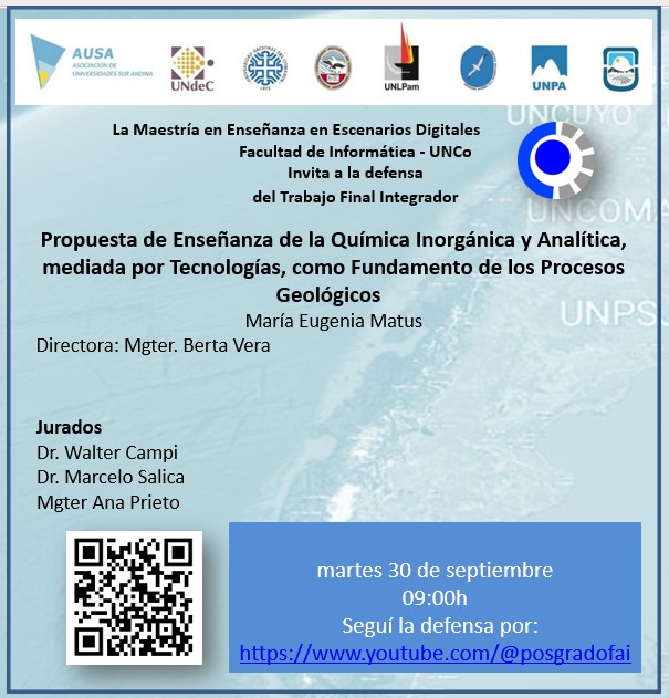 El  Martes 30 de Septiembre de 2025 a las 09:00 hs la maestranda María Eugenia MATUS, estudiante de la Maestría en Enseñanza en Escenarios Digitales, defenderá su trabajo Final Integrador “Propuesta de Enseñanza de la Química Inorgánica y Analítica, mediada por Tecnologías, como Fundamento de los Procesos Geológicos”  bajo la dirección de a Mg. Berta Emma VERA.